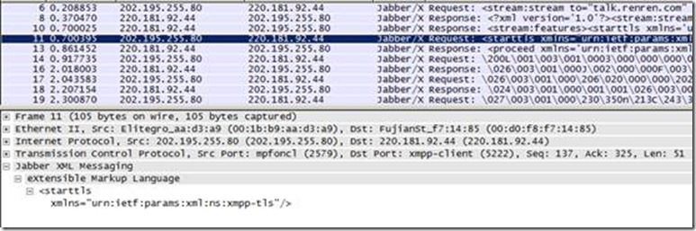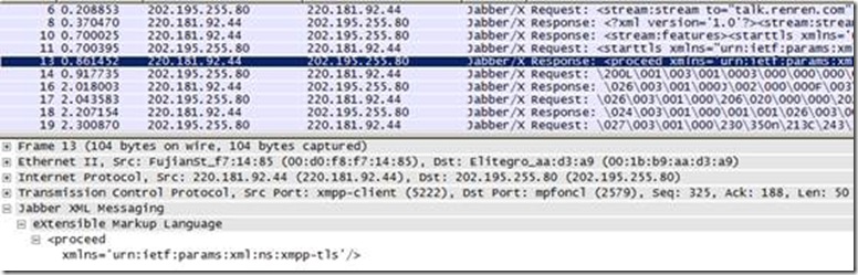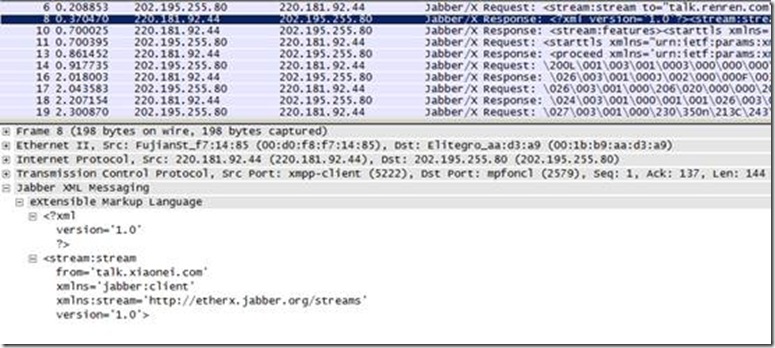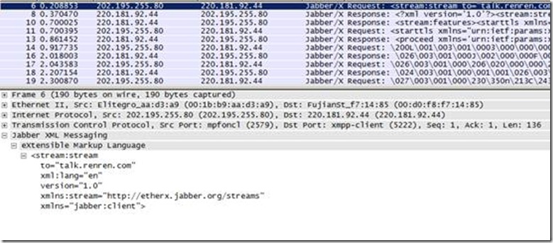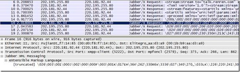 通过WireShark抓包来具体分析XMPP协议,下面用人人桌面版演示了,XMPP客户端从登录到获取新鲜事的过程,通过分析具体的数据包能够更容易的理解协议。