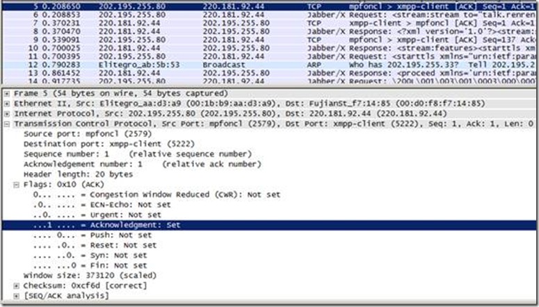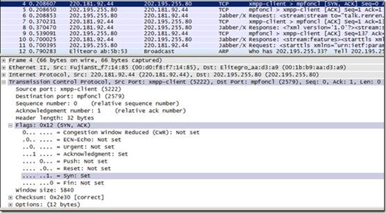 图1.xmpp客户端使用5222端口,设置SYN请求连接